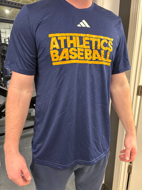 A's navy training shirt ( Blue shirt with ATHLETICS BASEBALL on front)